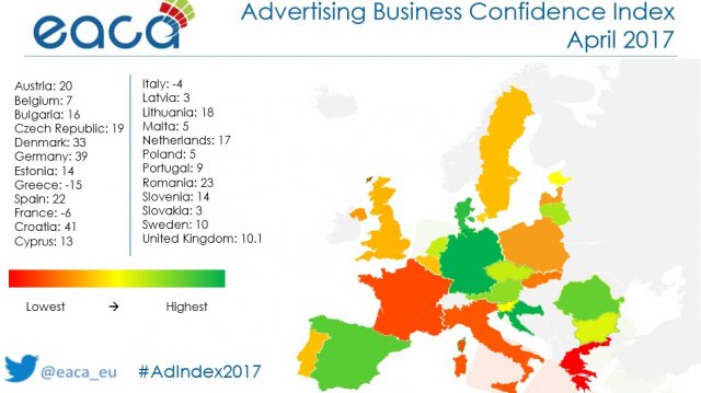 Индексът, измерващ бизнес климата в рекламния бизнес, е спаднал от +19 през януари 2017 до +12 през април същата година. Така бе сложен край на тенденцията за покачване на доверието, отчетена от рекламната индустрия през второто тримесечие на 2016.
