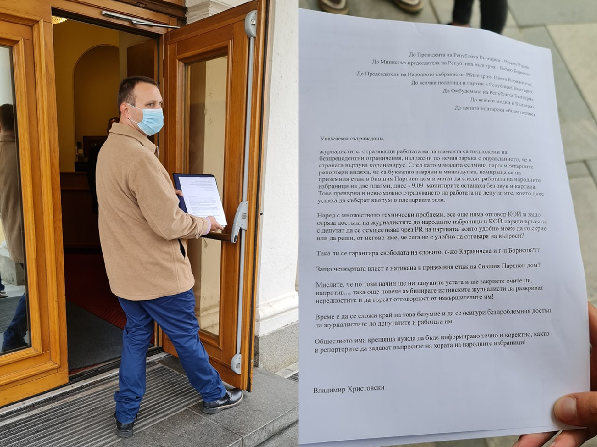 Журналистът Владимир Христовски внесе в деловодството на Народното събрание подписка срещу ограниченията за работата на журналистите в парламента, който от 2 септември – официалното начало на новия политически сезон – заседава в сградата на бившия партиен дом.