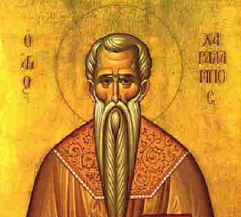 Св свмчк. Харалампий живял през II век в Магнезия, Мала Азия, епоха, дала много мъченици, защото имало страховити гонения срещу християните. Той бил много праведен и още приживе показвал своята святост, разпространявайки Божието слово. А не след дълго станал епископ и имал голямо влияние върху хората. Дълго живял той, почти 100 години, но жестокият римски император Септимий Север не го пожалил заради възрастта му и го измъчвал близо 13 години, само и само да се откаже от Христа. Твърд и непоколебим оставал той, а вярата му лекувала всичките му рани и всяка сутрин той осъмвал непокътнат. На 113 години издъхнал.