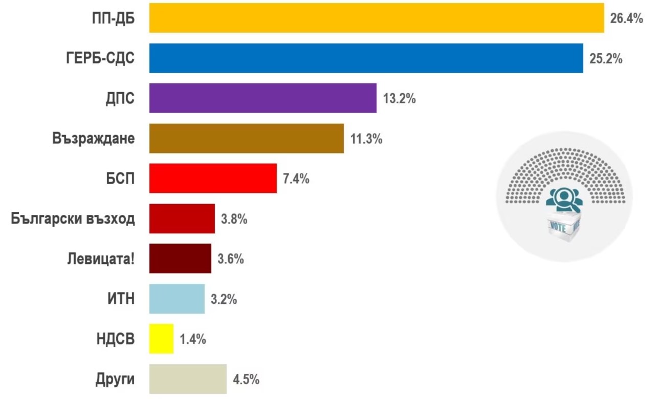 Нагласите на избирателите на старта на кампанията сочат паритет между коалициите ПП-ДБ (26.4%) и ГЕРБ-СДС (25.2%). Обединението между ПП и ДБ им носи символична начална преднина пред основния опонент ГЕРБ, но остава под сумарния им резултат от октомврийския вот. При очертаващата се ниска избирателна активност и в зависимост от кампанията, е възможно сравнително малък брой гласове да променят съществено тази дистанция във всяка от двете посоки.