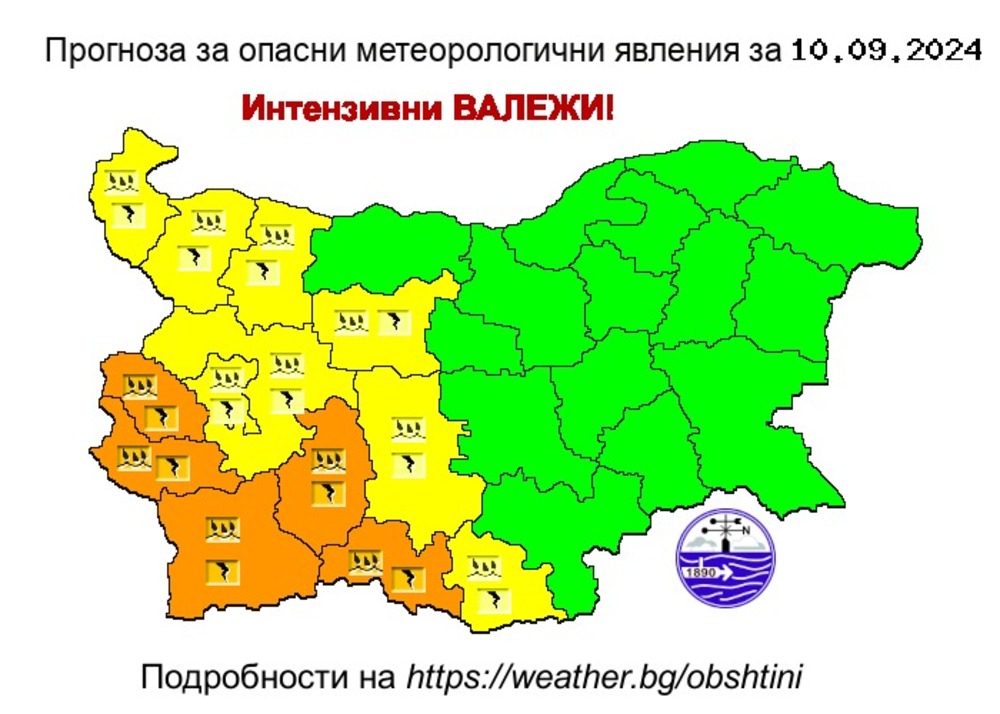 За 11 септември, сряда, още от днес НИМХ издава предупреждение от втора и първа степен – оранжев и жълт код, в Централна и Източна България за значителни валежи от дъжд и гръмотевици.