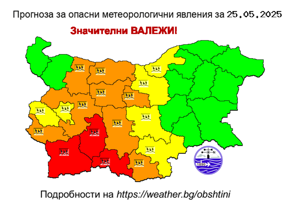 Оранжев код е обявен за осем области – Кюстендил, София област, Враца, Плевен, Ловеч, Габрово, Пловдив и Кърджали.