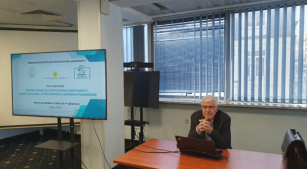 На 05.06.2025 г. на съвместно мероприятие между Центъра по трансфер на технологии към Химикотехнологичния и металургичен университет, създаден по проект „Биоактивни органични и неорганични авангардни материали и чисти технологии“ по Националния план за възстановяване и устойчивост и БТПП проф. дтн. Николай Дишовски изнесе доклад на тема “РАЗРАБОТВАНЕ НА ЕЛАСТОМЕРНИ КОМПОЗИТИ С МИКРОВЪЛНОВИ, АНТИСТАТИЧНИ И АНТЕННИ ПРИЛОЖЕНИЯ”, в който бяха представени резултатите от разработения под негово ръководство, съвместно с фирмата Center for Disruptive Innovation Ltd, научно-изследователски договор.
