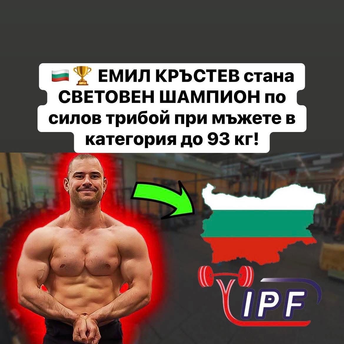 Българският състезател по силов трибой Емил Кръстев постигна феноменален успех, спечелвайки **световната титла при мъжете** с общ резултат от **910 килограма** – **клек: 315 кг**, **лежанка: 240 кг**, **мъртва тяга: 355 кг**.