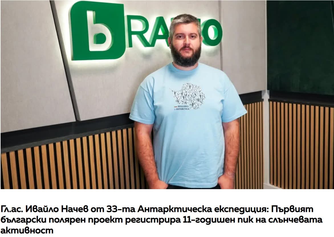 Чуйте повече от интервюто на Георги Митов с гл.ас. Ивайло Начев от катедра „Радиокомуникации и видеотехнологии“ на Технически университет- София и участник в 33-та Антарктическа експедиция: https://btvradio.bg/intervuta/za-grada/gl-as-ivajlo-nachev-ot-33-ta-antarkticheska-ekspedicija-parvijat-balgarski-poljaren-proekt-registrira-11-godishen-pik-na-slanchevata-aktivnost.html