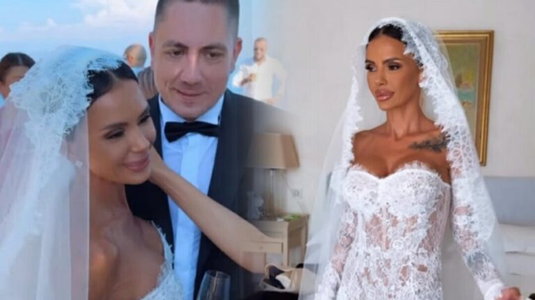 43-годишната булка бе изключително елегантна в изцяло дантелена рокля на българския дизайнер Дидо Георгиев. С кройка, описваща тялото, без презрамки и с горна част тип корсет, младоженката изглеждаше стилно. Косата й бе прибрана, а ефирен и дълъг воал я покриваше.