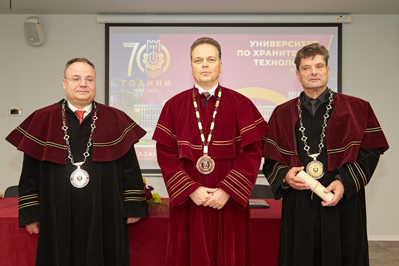 На тържествено заседание на Академичния съвет на Университета по хранителни технологии – Пловдив (УХТ) днес ректорът проф. Галин Иванов връчи почетното звание „Доктор хонорис кауза“ на инж. Владимир Кисьов и проф. Иво Димитров.