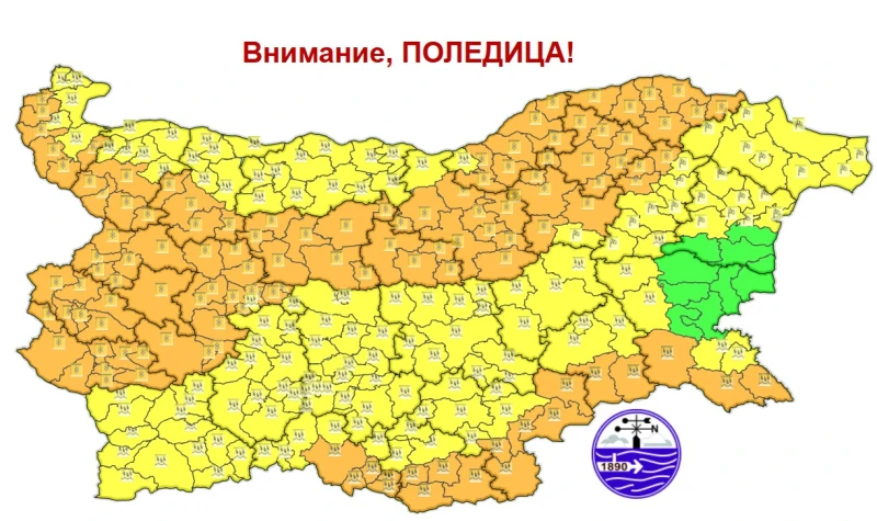 Половин България е с предупреждение от втора степен – оранжев код за лошо време. Ще вали дъжд и сняг, а това е предпоставка за образуване на поледици. За останалата част от страната в сила е жълт код. Част от Бургаска област е единствената оцветена в зелено на картата.