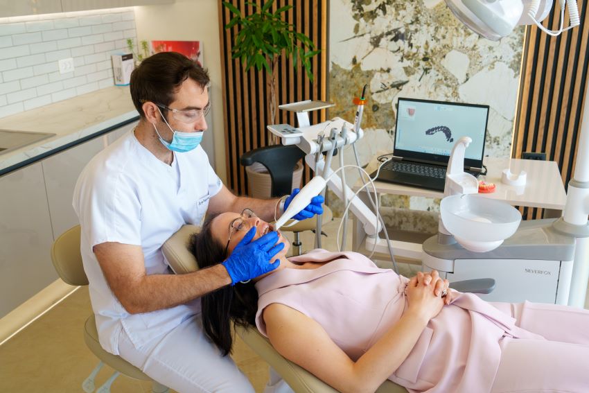 В нашата практика използваме съвременни дигитални технологии, които ни позволяват да поставим по-точна диагноза, да планираме по-прецизно лечението и да предложим на пациента яснота и предвидимост още от самото начало. Вместо класически отпечатъци използваме дигитално 3D сканиране, което е бързо и комфортно, елиминира неточностите на традиционните отпечатъци и създава изключително точен дигитален модел на зъбите. Пациентът вижда собствената си захапка в реално време на екран. Създадените 3D модели ни позволяват да анализираме пространството, наклоните и движенията на зъбите, да симулираме различни лечебни варианти, да планираме лечението етап по етап. Това прави плана по-предсказуем и индивидуален. Комбинираме 3D модели, рентгенови изследвания, лицеви и интраорални снимки. Така получаваме цялостна картина за функцията, захапката и лицевите пропорции. Използваме софтуер с елементи на изкуствен интелект, който подпомага анализа, предлага възможни сценарии и улеснява прецизното планиране. Важно е да се подчертае, че AI не взема решения вместо ортодонта, а служи като допълнителен инструмент към клиничния опит.