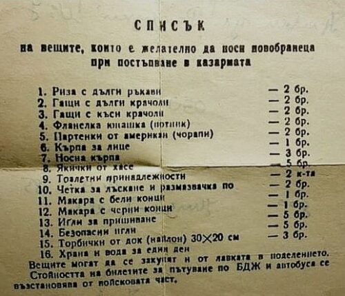 Ремонтирах къщата си в Айтос и, претърсвайки архивите си, попаднах на стария си „оня списък“. Той е от 1974 г., когато положих клетва в НШЗО „Христо Ботев“ – Плевен, но този списък е отпреди 25.09.1973 г., когато всеки получаваше предварително „Списък на вещите, за които е желателно да носи новобранецът при постъпване в казармата“.