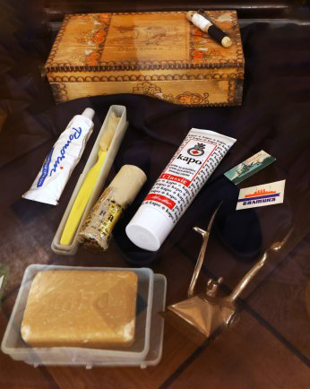 В списъка има още тоалетни принадлежности, в които имаше четка за зъби и паста за зъби, четка за размазване на ваксата върху обувките, макара за бял и черен конец, игли за пришиване, безопасни игли, торбички за док. Родителите ми ме бяха инструктирали да имам няколко празни плика и празни листове за писане на писма.