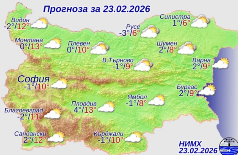 Днес ще е предимно слънчево. Преди обяд от северозапад облачността ще се увеличава и до вечерта ще обхване и Югоизточна България. Привечер в крайните североизточни райони ще превали дъжд. Ще духа слаб до умерен вятър от запад-югозапад. Максималните температури ще са между 8° и 13°, в София – около 10°.