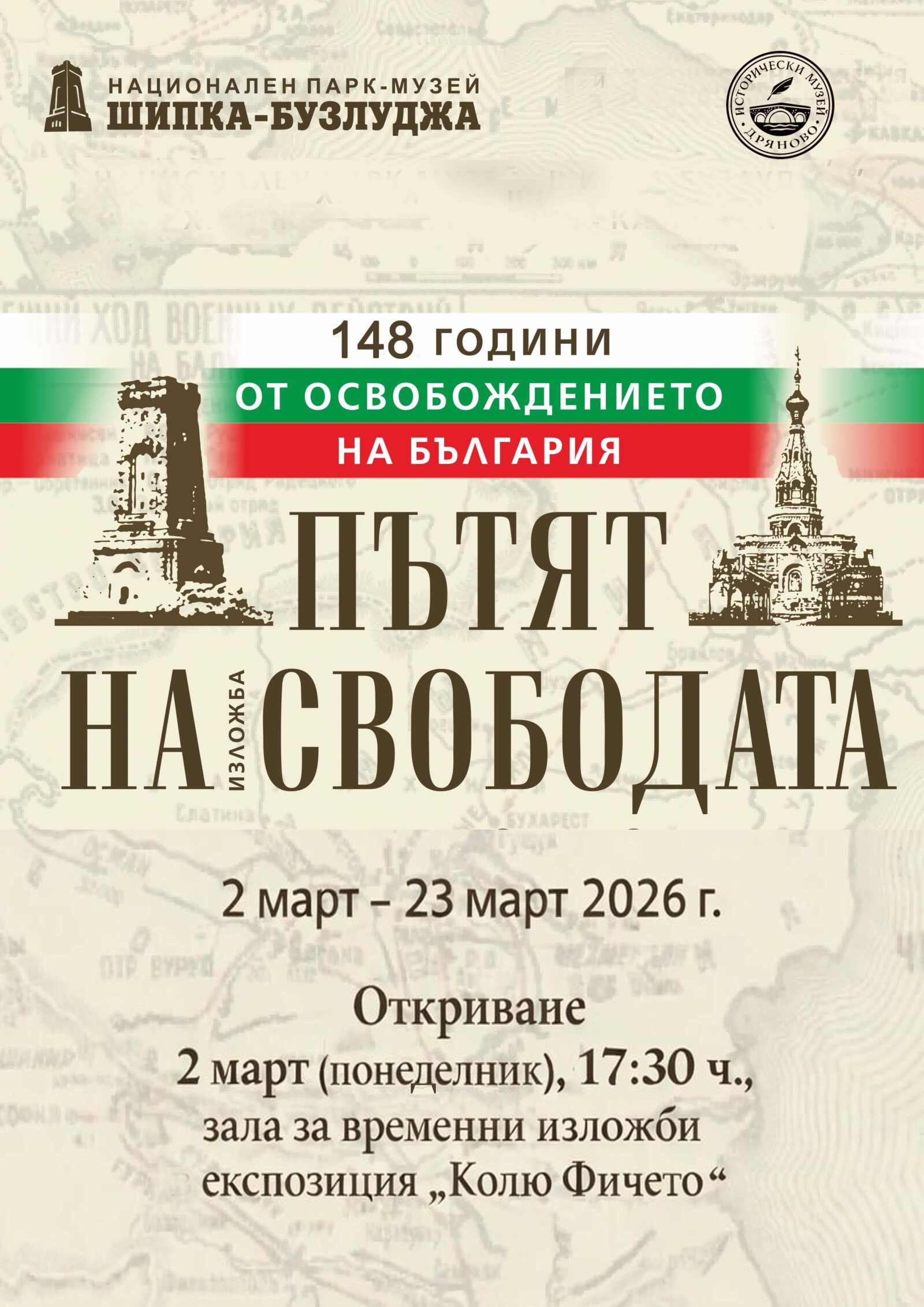 По повод 148 години от Освобождението на България и националния празник – 3 март, в Исторически музей – Дряново ще бъде открита изложбата „Пътят на свободата от Шипка до Сан Стефано“. Събитието ще се състои на 2 март (понеделник) от 17.30 часа в залата за временни изложби на експозиция „Колю Фичето“.