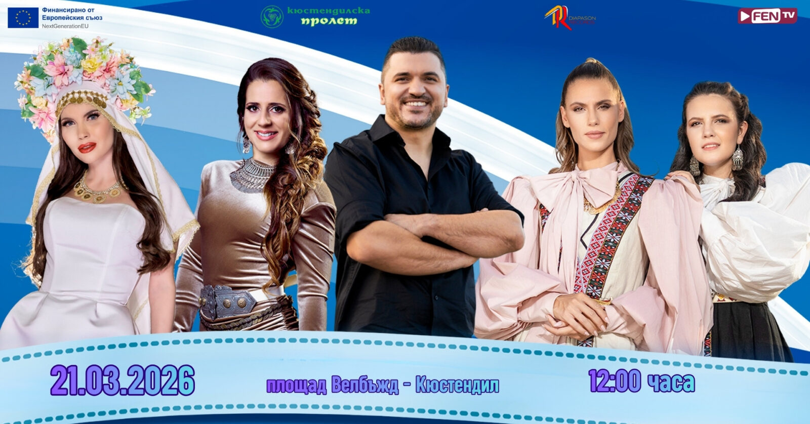 На 21 март в 12:00 часа, площад „Велбъжд“ в Кюстендил ще се превърне в сцена на съвременното звучене на българската традиция. В рамките на фестивала „Кюстендилска пролет“ ще бъде представен проектът „Фолк Фюжън: Нови звуци на българския фолклор“ – музикално събитие, което обещава да срещне магията на народната песен с пулса на модерното време. Проектът на Diapason Records е осъществен с финансовата подкрепа на ЕС (Next Generation) чрез НПВУ – BG-RRP-11.020-0061-C01