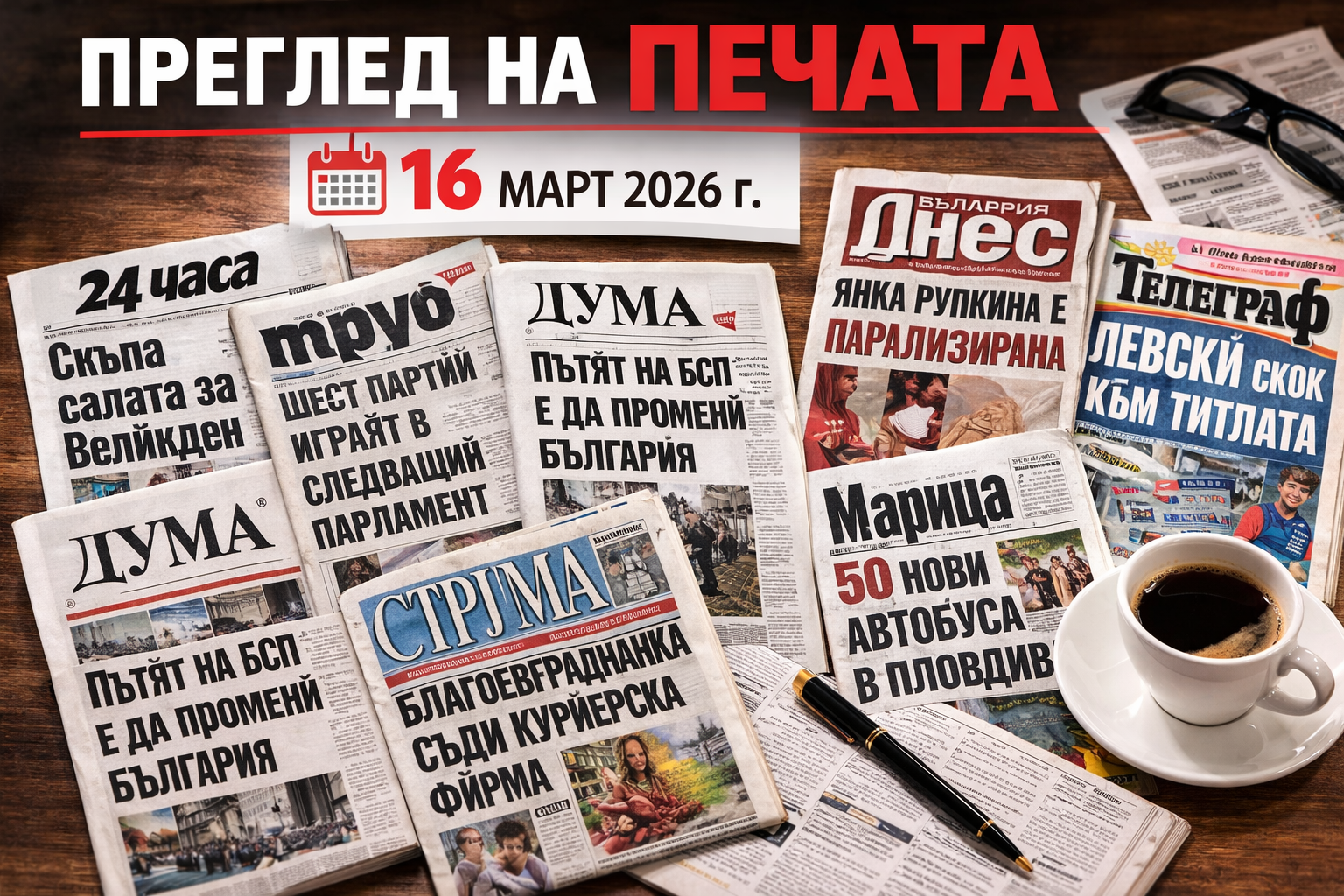 Днешните първи страници на българските вестници очертават картина на политическо напрежение, икономически тревоги за цените на храните и горивата, социални драми и спортни новини. Основните теми се въртят около предстоящия парламент, поскъпването на храните преди Великден и регионални инциденти.