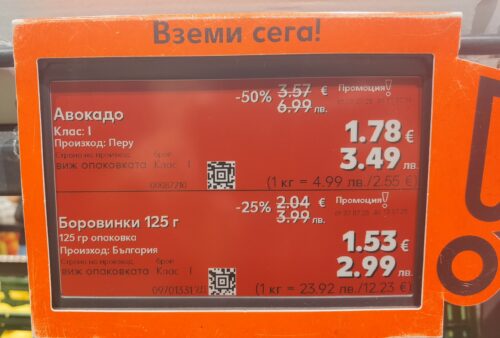 Хората с познания в маркетинга на храни са наясно с повечето психологически тактики, използвани в големите хранителни вериги с цел да ни продават най-различни изкуствени изобретения, които ни правят дебели и болни, но сега същите тези места започват да се използват и за политически манипулации чрез доста грубовати психологически техники. Да започнем с двойните цени, от които няма никакъв смисъл, и то при положение, че от радиоуредбата ни обясняват постоянно, че може да се пазарува единствено с левове. Тогава защо има цена в евро? Българите не са идиоти и няма нужда да бъдат подготвяни за използване на еврото в магазините- просто, ако бъде прието еврото, цената ще бъде сменена от лева в евро. Двойни цени се използват само в държави, където еврото не е прието да замени собствената им валута. Като в Норвегия например- там цените са изписани както в крони, така и в евро. Двойното изписване на цените би имало смисъл само ако се опитват политически да ни убедят, че еврото е вече прието и няма връщане назад. Обаче Kaufland се опитват да го „играят“ като още по-добри манипулатори и от политиците. Не знам дали се отнася за всичките магазини на веригата, но в Русе смениха позицията на цените: най-отгоре поставиха цените в евро, а под тях са цените в лева, като за допълнително объркване знака за евро и думата за лев се поставят над цифрите на някои места и ако бързате може да се объркате за коя точно цена се отнасят. На същия принцип биха могли да поставят цени в долари, йени, донгове, реали, франкове или каквато и да е друга валута. Обърнете внимание, че за представянето на цените в момента има три варианта в Kaufland: биохраните са с цени, изписани само в лева, а при всички останали продукти се използват два подварианта на двойното изписване в лева и в евро- в единия валутата е написана до цифрата, а в другия подвариант е изписана над цифрата. Може да видите това на снимките по-долу.