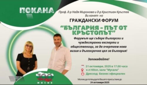 На 31 октомври т.г. ще се проведе граждански форум, организиран от обществената платформа „Мисия 100“ под мотото „България – път от кръстопът“.