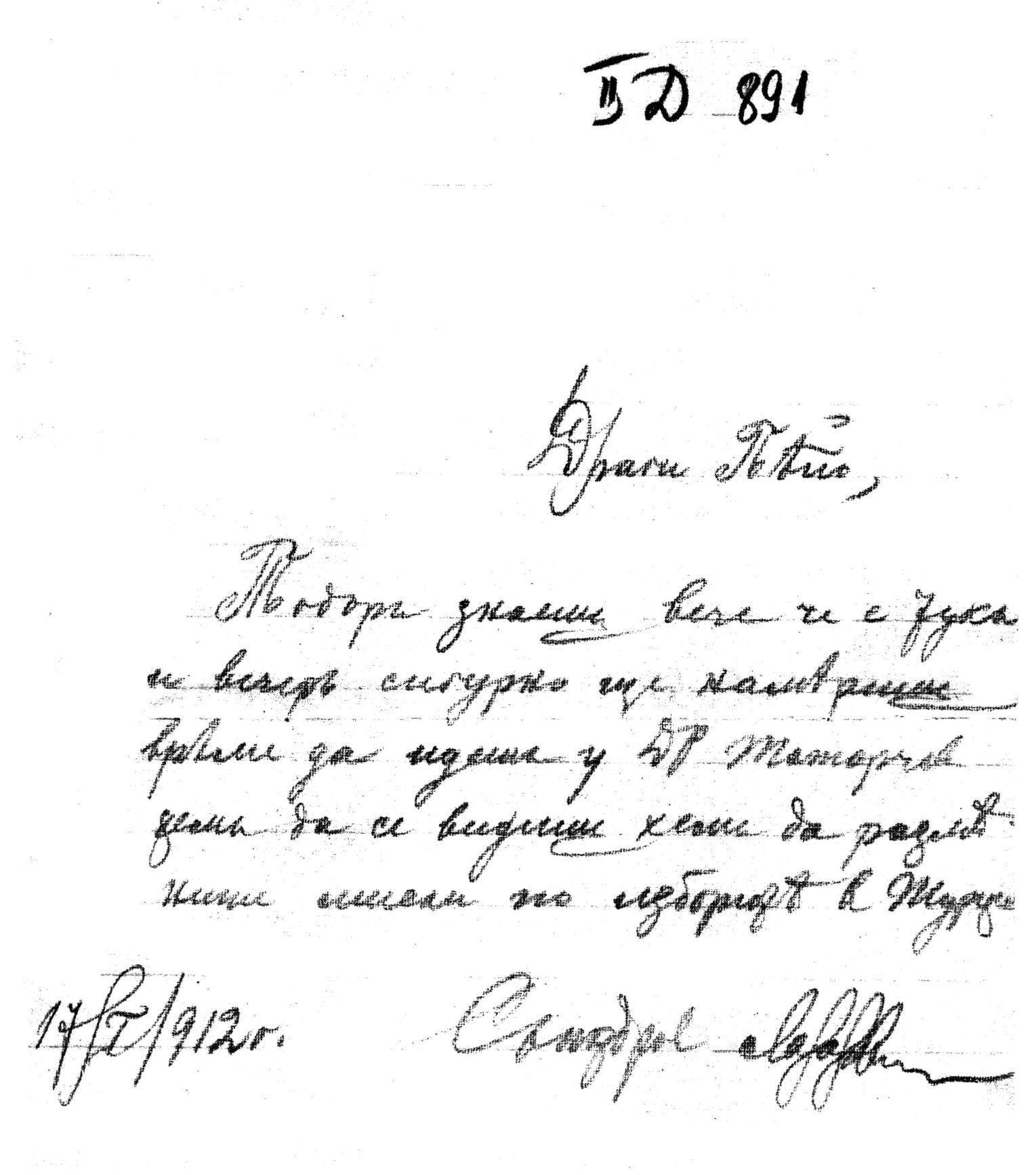Писмо на Тодор Александров до Пейо Яворов с молба да обсъдят с д-р Хр. Татарчев проблемите пред ВМОРО след изборите в Турция, 17 януари 1912 г.